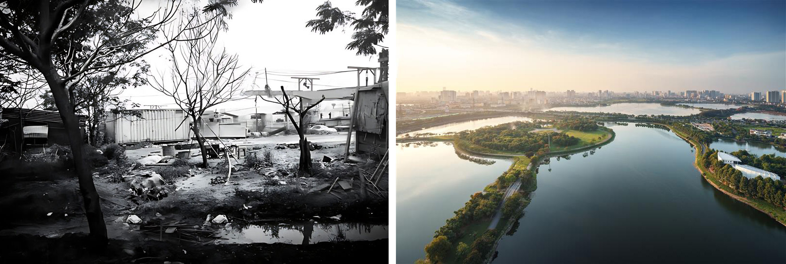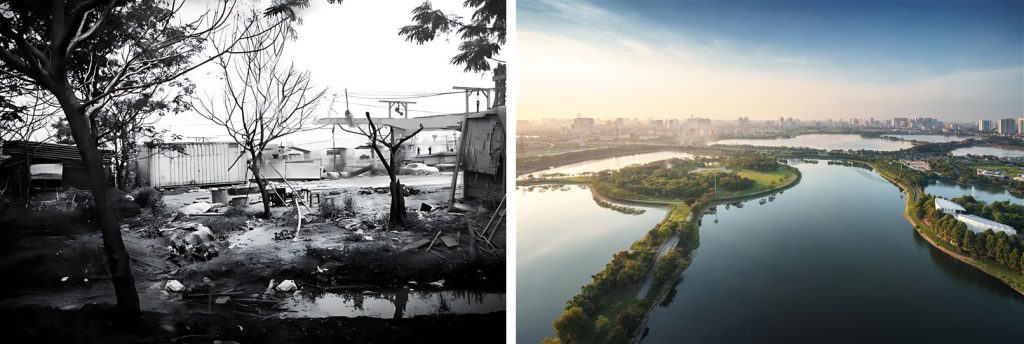 Yen So’s park and lakes blend urban regeneration with masterful township planning. Today, if you visit it, you could never imagine what it looked like a decade ago [left].